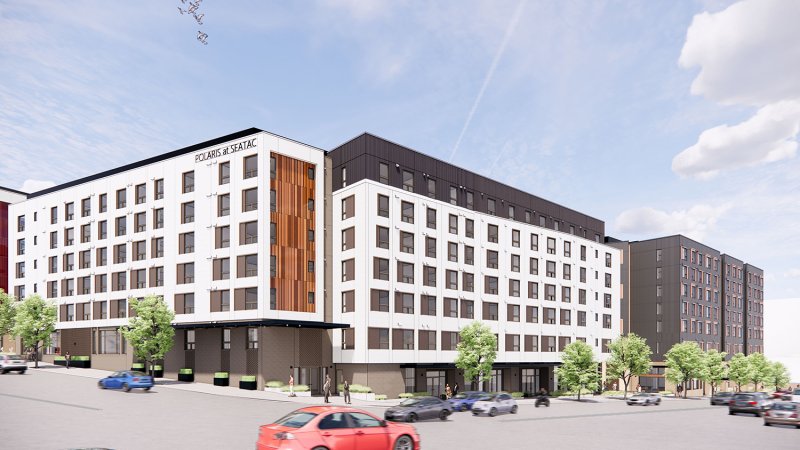 When complete, the Polaris development in SeaTac will consist of two mixed-use residential buildings: Polaris and Adara. Polaris is a two-tower, six-story complex over a common parking garage shared with Adara (a seven-story building). Polaris and Adara will be situated near a light rail station. Polaris at SeaTac will comprise of five wood framed levels over four concrete levels; 365 living units; three levels of below-grade parking for 418 cars; and commercial space. Adara at SeaTac will comprise of five wood framed levels over four concrete levels; 220 residential units; two levels of below-ground parking for 295 cars; and commercial space when completed in late 2022.